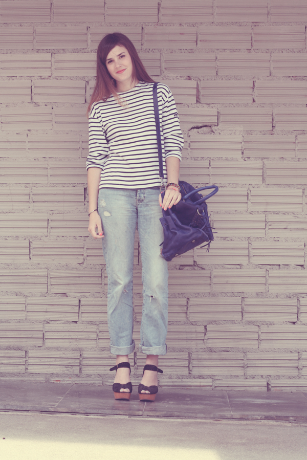 Marinière Armor Lux – Jean boyfriend H&M (old) – Sandales Rocket Dog – Sac Who’s the Queen IKKS – Boucles d’oreille homemade.