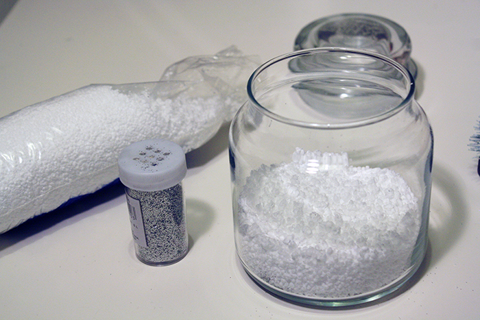 Ensuite, c’est tout simple, il vous suffit de tout mettre dans le pot! Mélangez des paillettes dans la neige, ajoutez vos figurines et saupoudrez-les à leur tour.