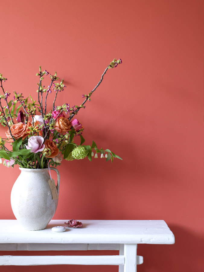 La console avec le mur corail et le bouquet de fleurs sont magnifiques !
