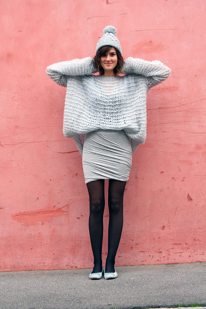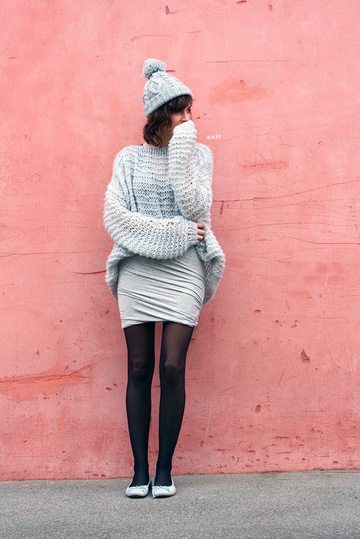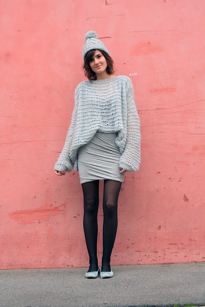 Je vous parlais il y a quelques jours de mon nouveau petit pull, choisi dans cette couleur. C’est également dans cette nuance que je me suis commandé une deuxième jupe drapée (une taille au-dessus cette fois, grâce à cet article de L’Autruche). Et aussi un sweat et un tshirt que je vous montrerai bientôt… Bref, une véritable obsession! Coup de chance, c’est aussi dans un gris, un peu bleuté cette fois, que ma maman m’a tricoté mon pull et que mon frère m’a offert un joli bonnet à pompon. Et j’ai une paire de ballerines assortie!