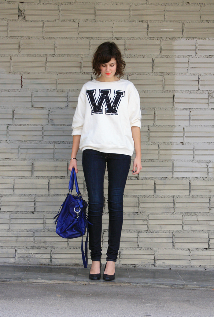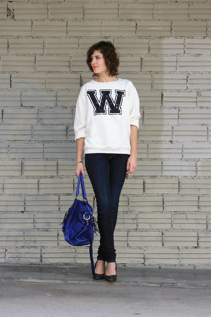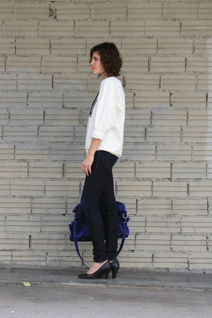 Objet d’amour numéro 1: le sweat, bien entendu. Je vous l’ai déjà dit, la proportion de ce type de pull dans mon dressing a augmenté de façon exponentielle ces derniers mois, et ça n’est pas prêt de s’arrêter. Le dernier arrivé, c’est ce sweat blanc qui provient de la nouvelle collection Zara. J’ai flashé sur sa coupe et sa couleur, qui correspondent pile à ce dont j’ai envie pour ce printemps. Une fois porté, il est vraiment parfait: le volume légèrement oversize se marie très bien avec un bas bien slim, et le tombé est idéal. Ça fait sweat de mec tout en s’adaptant magiquement bien au corps féminin. Pour pallier le côté « baseball » de cette pièce, je la porte de la manière la plus féminine possible tout en restant dans un style simple. Des talons, des cheveux libres, un sac de style bowling mais travaillé, une bouche néon, et le tour est joué!