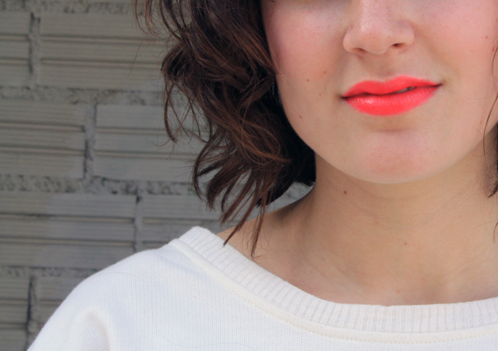 J’aime beaucoup le contraste entre le rouge à lèvre néon et le sweat mais moins le sac et les escarpins :/