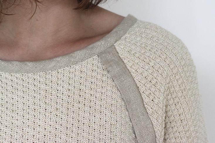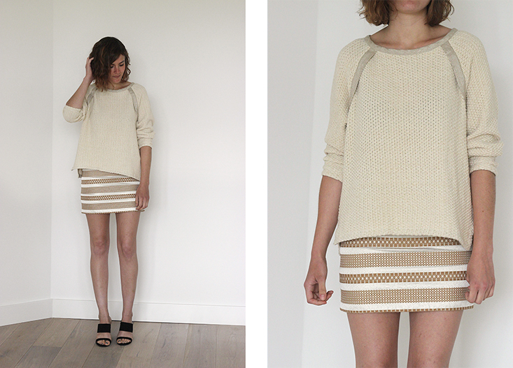 Mon coup de coeur virtuel, c’est peu de le dire, s’est complètement confirmé dans la réalité. Tombé et solidité des matières, coupes, empiècements originaux, tout m’a paru pensé et conçu avec soin. Mais surtout, je suis tout simplement tombée amoureuse de ce duo très représentatif des pièces phares de la collection, un pull style « sweat » et une minijupe dans des tons beiges et dorés. En les portant, j’ai l’impression de me transformer en ma version améliorée, en la fille que je cherche à être: cool mais féminine, simple mais pleine de style, avec un vrai sens du détail. Je sais que c’est idiot, mais c’est encore une fois comme si cette tenue avait été faite pour moi, comme si elle me révélait…!