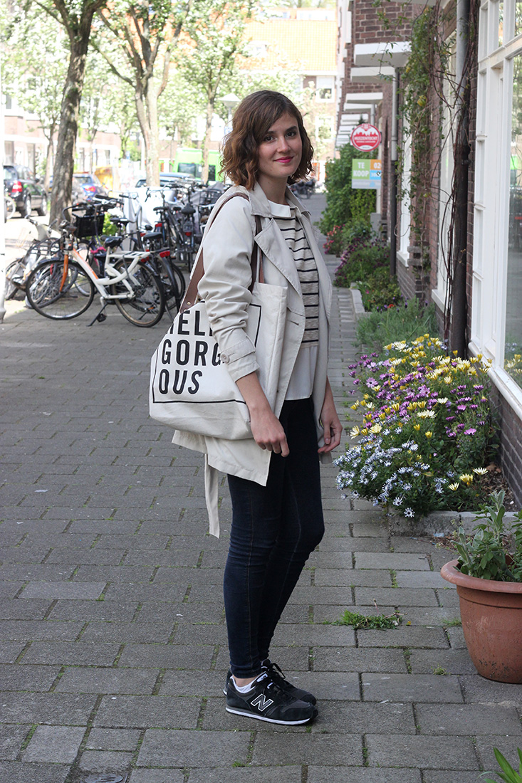 Vous connaissez ma réticence naturelle envers l’excès de girly (sur moi uniquement; sur les autres, j’adore!). Pour accompagner ces deux éléments très féminins, j’ai donc choisi des pièces plus casual, voire un peu boyish: un trench loose légèrement boxy, mon tote-bag de tous les jours, un jean confortable et des baskets (piquées à mon mec). Je trouve que l’équilibre obtenu est plutôt réussi, et me ressemble finalement plus que ce que je n’aurais imaginé!
