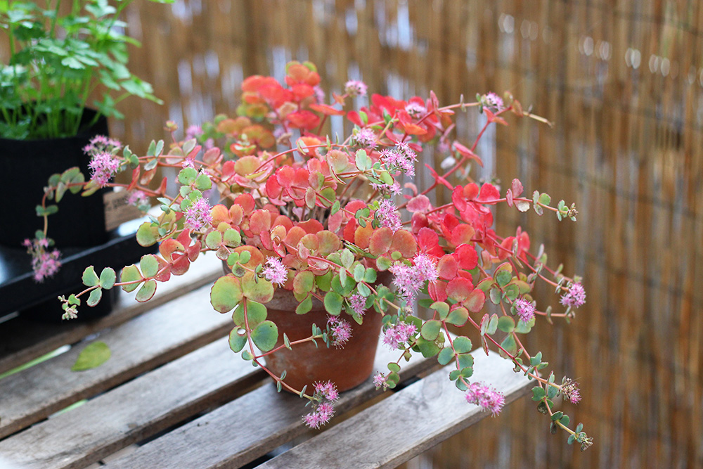 C’est sans doute le « favori » le plus insignifiant de cette liste, et la photo par temps pluvieux ne lui rend pas vraiment justice, mais voilà: je suis complètement émerveillée devant la beauté de mon sedum sieboldii en pleine floraison. Vous vous souvenez peut-être de cette succulente japonaise, dont je vous avais parlé dans mon dernier article sur les plantes vertes. La voici dans sa plus belle parure automnale: des petites fleurs roses, et des feuilles couleur de feu !