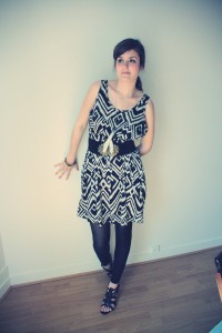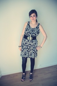 Robe H&M – Ceinture Primark – Collier H&M – Leggings H&M – Chaussures Miss Coquines (eh oui !) – Bracelets Plata de Palo & Marc Jacobs