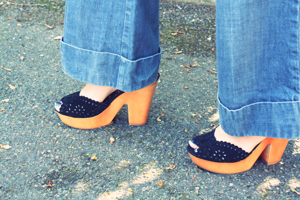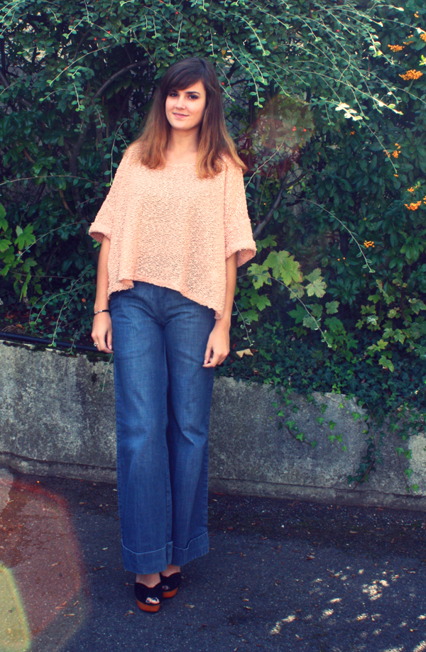 Chez mes parents, j’ai retrouvé un jean très flare, très 70’s, acheté en 2008, et que je n’avais jamais remis depuis. Pourtant je l’adore, et je profite donc désormais de la tendance actuelle pour abandonner un peu mes slims. Avec un pull court et des sandales sabot, on se sent tout de suite projeté dans les années hippie!