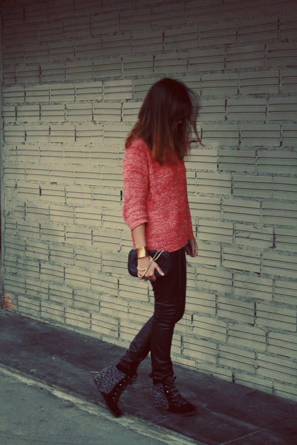 Pull Zara (collection été) - Pantalon similicuir H&M - Compensées Custo Barcelona - Manchette Kiss Me Zombie - Sac vintage.