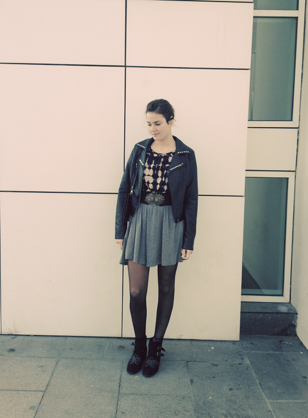 Top Forever 21 – Jupe H&M – Ceinture Primark – Boots Reqins via Brandalley – Perfecto La Redoute.