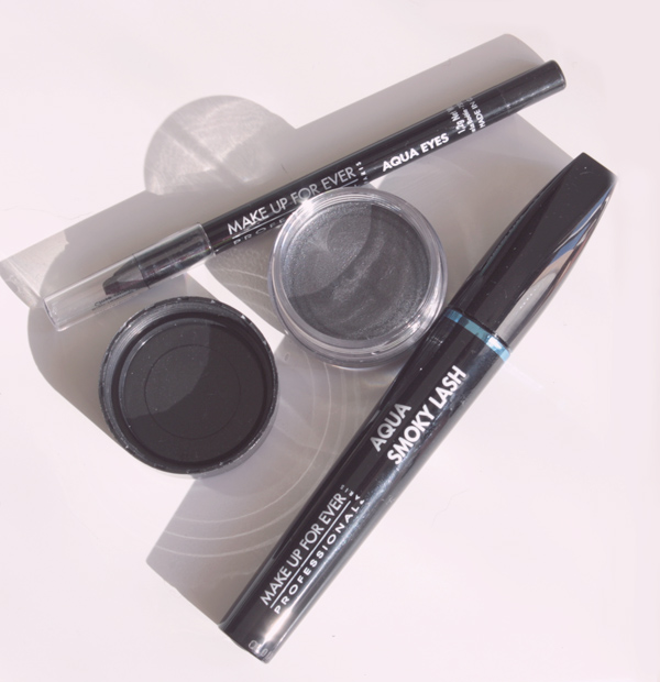Vous aviez été nombreuses à me complimenter sur mon maquillage dans ce look, alors voici aujourd’hui son secret! J’ai profité des soldes pour m’offrir l’un des petits kits Make Up For Ever sur lesquels je lorgnais toujours chez Sephora: le kit smoky eyes. A l’intérieur, un Aquacream (ombre à paupière crème waterproof) de couleur anthracite, un crayon Aqua Eyes noir, un mascara Aqua Smoky Lash noir et une miniature de démaquillant waterproof de la marque. Si j’étais avant tout attirée par l’idée de tester l’aquacream et de le comparer à mon paint pot de MAC, en réalité, ce que je retiens de ce kit, c’est le côté waterproof. N’importe lequel de ces trois produits, une fois appliqué, reste incroyablement résistant au temps et à l’eau. De vraies merveilles qui m’ont fait oublier mes préjugés sur les produits waterproof, et que je viens aujourd’hui vous présenter!