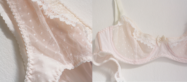 Ce petit ensemble « Galante » LJT est soldé à -50% avec le soutien-gorge à 33,50€ au lieu de 67, et la culotte à 23,75€ au lieu de 47,50. J’en suis tombée amoureuse dès que je l’ai reçu; c’est un modèle très joli, délicat et romantique, tout en transparences. J’aime beaucoup le plumetis blanc sur fond rose pastel, les petits noeuds sur le devant du soutien-gorge et sur l’arrière de la culotte, et surtout les galons de dentelle qui font comme des petits froufrous autour des coutures. Trop mignon!