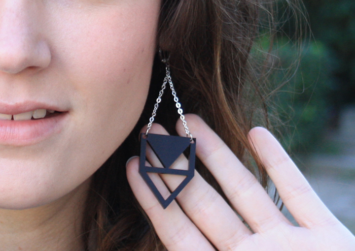 Cette nouvelle collection, Limited, est composée autour de pièces en acrylique et bois découpées au laser. Le résultat est très chouette: on y trouve des bijoux géométriques et des formes « pictogrammes », le tout dans un style décalé et original. C’est cet esprit fun qui m’a séduite. J’ai jeté mon dévolu sur une paire de boucles d’oreilles noires, afin de pouvoir les associer facilement à mes vêtements; leur forme géométrique fait la part belle aux triangles, et je suis assez impressionnée par la qualité de l’acrylique découpée. Les finitions sont parfaites. La magie du laser, bien sûr, et le résultat d’un soin tout particulier pendant la création – je sais qu’Elena a mis tout son coeur dans ce nouveau projet et cela se sent. Sur le bois aussi, j’aime beaucoup les finitions « fumées » du laser, par exemple sur ces boucles d’oreilles. Bref, cette collection est une réussite!