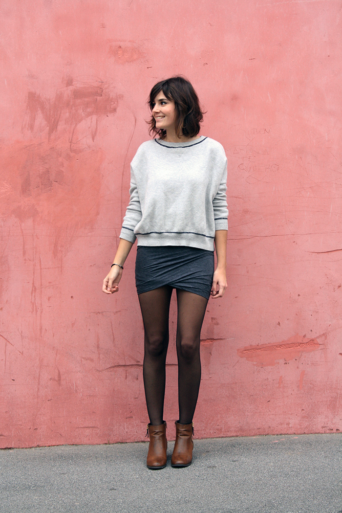 2. Alors, pour commencer, non, tu n’as absolument rien d’un saucisson ! Cette jupe te va parfaitement ! Et puis j’adore tes chaussures, moi aussi j’ai craqué pour des bottines cloutées à l’arrière, c’est rock sans trop en faire !