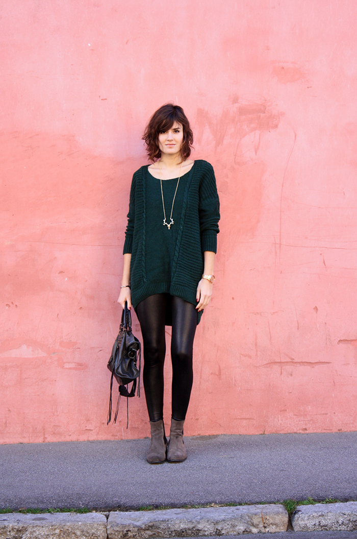 Oh!! ce look est superbe! je crois même que c’est un de mes préféré! <3 La laine mélangé à la matière du leggings, je trouve ça parfait! C'est marrant car moi aussi je bloquais sur le vert, mais là tu m'a fait définitivement changer d'avis! :p