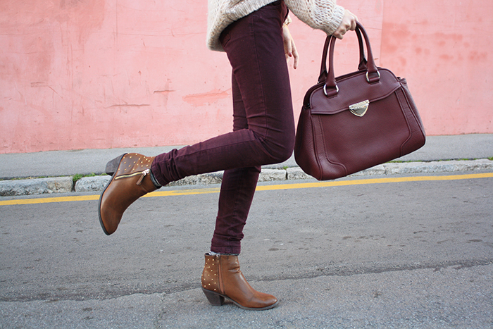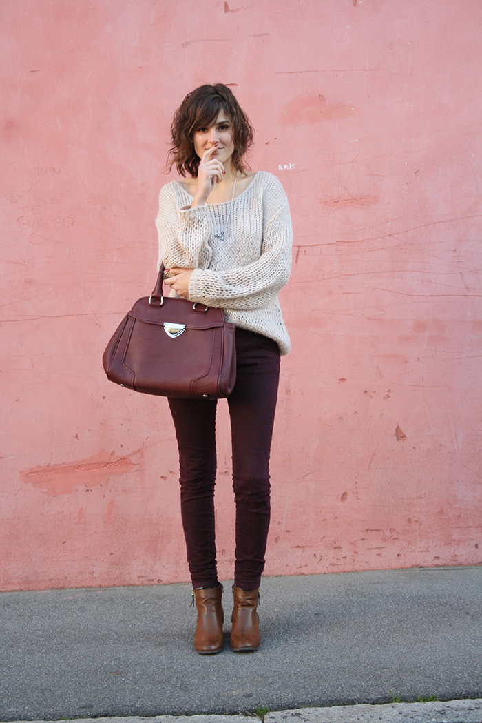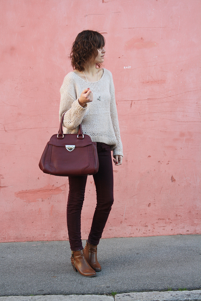 Encore une chouette tenue, j’adore le bordeaux, et cette couleur te va très bien. Magnifique sac, j’aime beaucoup la marque Bimba & Lola :)