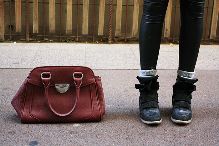 Et puis cette semaine, suite à vos commentaires sur ce look, j’ai eu envie de tester l’association gros pull chunky / legging serré. J’y suis allée à fond: legging brillant, chaussettes hautes et baskets. Peut-être un peu trop par rapport à mon style plus casual-androgyne de tous les jours… Pas sûre que ce soit vraiment mon truc, en fait, de porter des leggings. Je crois que mon amour du denim et des slims est trop fort ;)