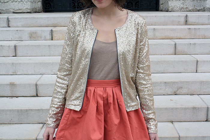 Chouette, un nouveau défi look! Nous vous retrouvons aujourd’hui autour d’une pièce magnifique et ultra girly qui nous a été envoyée par l’un de nos précédents partenaires, , pour un second round. Vous vous souvenez peut-être de l’épisode de la veste étoilée, qui vous avait manifestement bien plue. Cette fois-ci, c’est un spécimen à sequins que nous avons eu pour mission d’associer dans nos tenues. Les paillettes, moi, je les aime plutôt par toutes petites touches, pour donner un peu de glamour à mes tenues casuals – j’ai toujours un peu de mal avec le fait de porter des choses trop « fifille ». Pourtant, en découvrant cette veste, j’ai de suite adoré ses détails qui, selon moi, changent tout: sa forme féminine mais très basique, sans fioritures; sa couleur dorée mais très claire, qui ne fait pas trop bling-bling; et sa quantité de sequins, qui est parfaite. Pour ce défi, j’ai eu envie de vous proposer une tenue girly mais simple, avec une base portable en journée, sur laquelle la veste Bizzbee apporte une touche plus festive, parfaite pour briller en soirée. J’adore le résultat, qui bien que très « fifille », a pour moi la juste dose de glamour et de casual pour que je me sente bien. Et puis j’aime beaucoup le mélange des couleurs neutres avec le doré pâle et le rose pêche de la jupe.