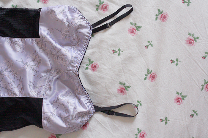« Ghost Retro » (c’est le nom du modèle) est un superbe body qui mêle le style pin-up années 50 et une touche graphique très originale. Sur la poitrine et sur la ligne centrale du ventre, il se compose d’un tissu satiné couleur lilas clair aux motifs floraux, dont la finesse me fait penser aux estampes chinoises anciennes. Tout le reste de la pièce est en tulle noir transparent. Bien confortable grâce à l’absence d’armatures, il modèle néanmoins très joliment la poitrine grâce à sa coupe ajustée et à ses coutures sur la ligne médiane des seins.