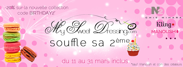 Pour bien commencer la semaine, festoyons! J’ai le plaisir de célébrer avec vous et quelques autres blogueuses le 2ème anniversaire de MySweetDressing, une boutique mode & accessoires ultra girly et pour tous les prix (de Kling à Manoush en passant par Danity, Chie Mihara ou Poupée Rousse…) dont je vous parle régulièrement. Pour fêter cet événement et l’arrivée de la nouvelle collection, nous vous avons concocté un petit concours particulièrement chouette, que vous découvrirez en fin d’article.
