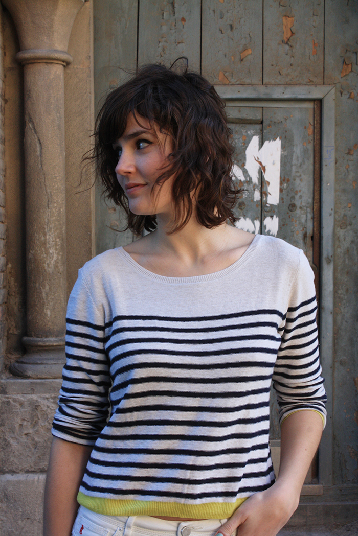 Coup de coeur aussi pour cette jolie marinière à la matière légère et fraîche (un mélange coton/lin) et à la coupe idéale, un peu courte comme j’aime. Son détail qui tue, ce sont ces bordures à la taille et aux poignets qui apportent une petite touche de couleur vive, là aussi très printanière. J’adore!