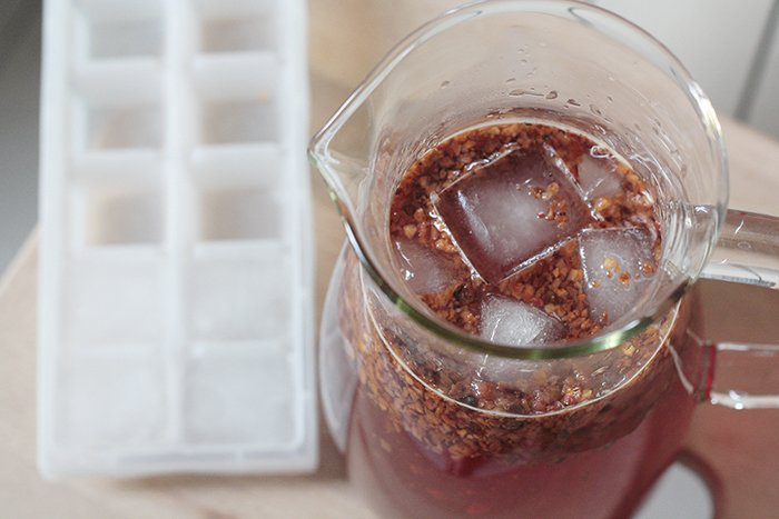 ♥ Une fois que votre eau est suffisamment froide (il vaut vraiment la peine d’attendre qu’elle soit très très fraîche, c’est bien meilleur), filtrez le mélange pour ne pas vous retrouver avec des petits morceaux dans votre verre, ce n’est pas très agréable! J’utilise pour ma part une carafe Forlife qui est ultra pratique pour le thé froid ou chaud, puisque son bouchon comprend un filtre intégré qui permet de retenir les impuretés sans aucun effort. En plus elle est en verre, donc sans risques pour la santé. Un gros must-have pour les fans d’infusions! Si votre carafe n’a pas ce système, utilisez un chinois.