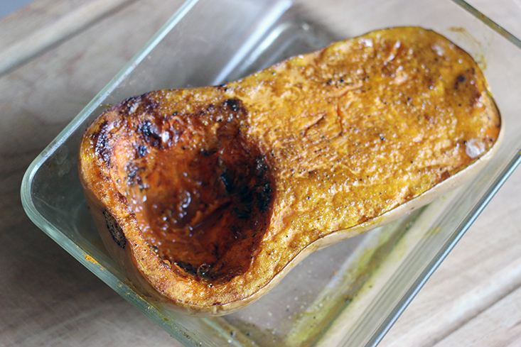 En automne, on a envie de cocooning, de textures réconfortantes, de repas chauds et moelleux. Ça tombe bien, parce que les produits de saison se prêtent tout-à-fait à ce genre de préparation! Pour moi, la crème de la crème dans ce domaine, c’est la courge butternut. Cette « Doubeurre » comme nous sommes sensés la nommer en français (on dirait une mauvaise traduction ou un nom à la Harry Potter) est probablement la plus raffinée des courges, avec sa texture ultra riche et onctueuse et son petit goût de noisette. Jusqu’ici je l’avais toujours utilisée en pâtisserie, notamment pour des flans ou des cakes épicés, ou en soupe. Mais bizarrement, je n’avais jamais eu l’idée de la consommer telle quelle. Puisqu’on la trouve en ce moment sur tous les étalages, j’en ai ramené une petite moitié chez moi il y a quelques jours pour rattraper ce grand manque à ma culture culinaire. Et MIAM, je peux vous dire que je ne m’en repentis pas!