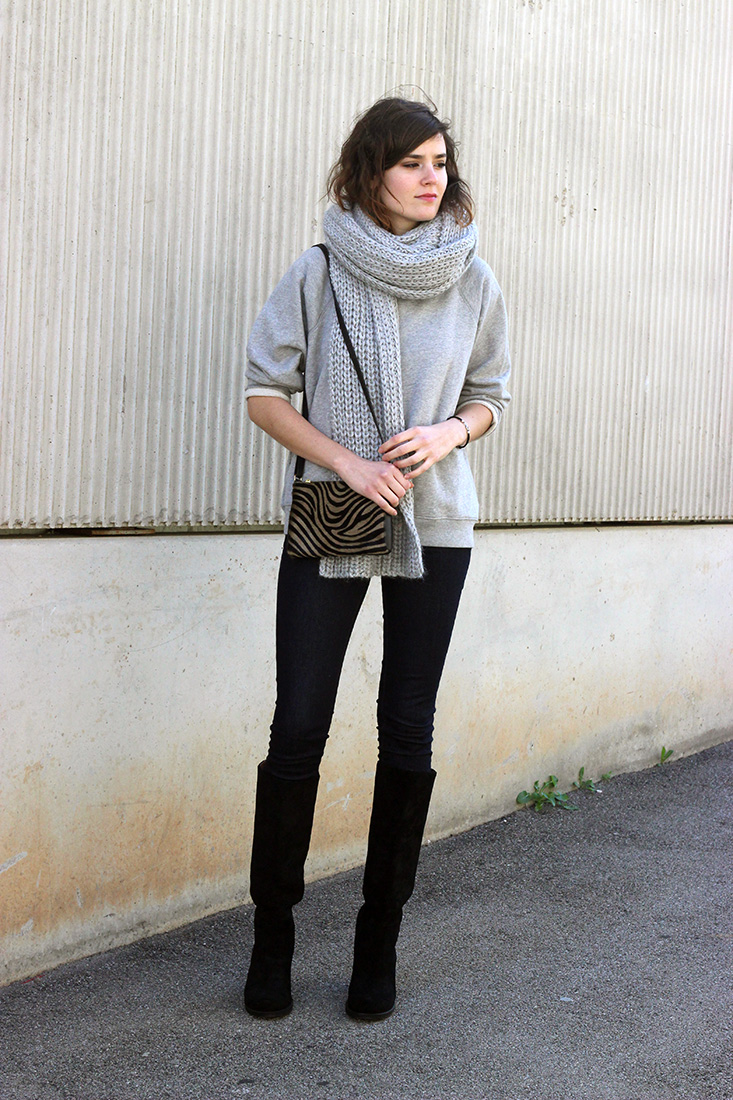 je crois que c’est mon look préféré!!! j’adore ce joli pull gris avec l’écharpe!et les cuissardes sont vraiment superbes!