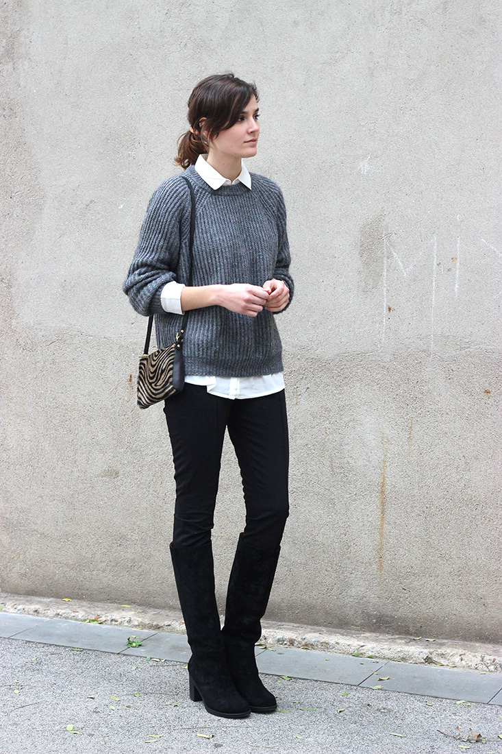 Moi je n’aime pas du tout les bottes elle plombe le look je trouve et ne vont pas à mon avis avec le pantalon et le style du look. J’aurais adhéré à 100% si tu avais porté des derbys (vernis ou pas) noires ou des running. Les coutures du pantalon lui donne un style plutot boyish ou sportswear. Quand aux bottes associées à une mini jupe noire et des collants pas trop opaque (avec le mm pull gris) auraient été mille fois plus mises en valeur. Mais ce n’est que mon avis. :)