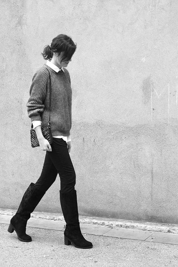 Pull Zara – Chemise 3 SUISSES (offerte) – Pantalon ASOS – Bottes & Other Stories – Sac Pretty Wire (offert)