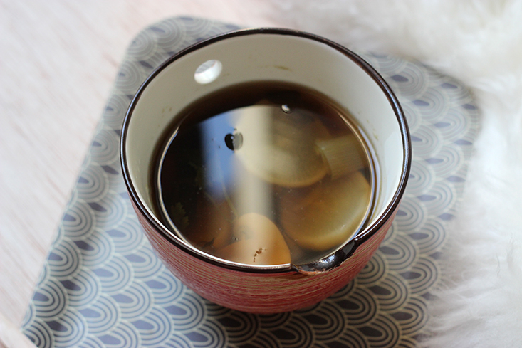 J’ai été lancée dans cette vague bouillonnante (huhu) sous les conseils de ma naturopathe, en raison de petits problèmes de santé pour lesquels je dois changer un peu mon régime alimentaire jusqu’à nouvel ordre. Je n’étais pourtant pas du tout adepte de cette préparation (sauf avec des vermicelles en hiver!) que je trouvais un peu fade en soi. C’était sans compter sur mon inspiration du moment, la cuisine japonaise, qui m’a donné l’idée de customiser mon bouillon traditionnel avec une petite touche asiatique. Le résultat est plus parfumé qu’une soupe basique, et la présence d’algues et de sauce soja renforcent encore davantage les bienfaits nutritionnels du mélange. Tip top!