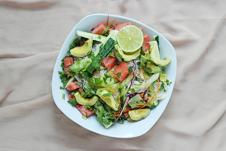 J’ai donc rassemblé toutes les textures et saveurs que je préfère pour un déjeuner qui sent l’été: de la pastèque et du concombre pour le côté aqueux, de la laitue iceberg et des crudités râpées pour le croquant, des herbes ultra parfumées et du citron vert pour la fraîcheur, et enfin des vermicelles de riz et de l’avocat pour la touche plus moelleuse et gourmande (et parce que je ne peux pas m’empêcher de tout ramener au bobun vietnamien qui reste ma salade préférée du monde entier).