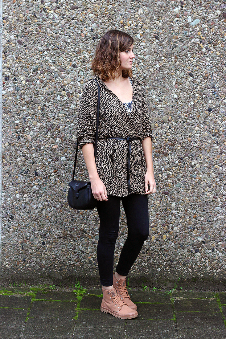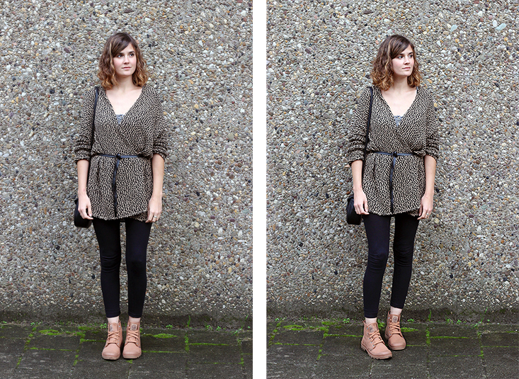 En ce qui concerne la tenue que j’ai choisie, je suis restée dans une thématique de confort avec un leggings et une sorte de gilet-kimono. Je les porterai également avec des gros pulls en maille oversize. Comfy is the new sexy!