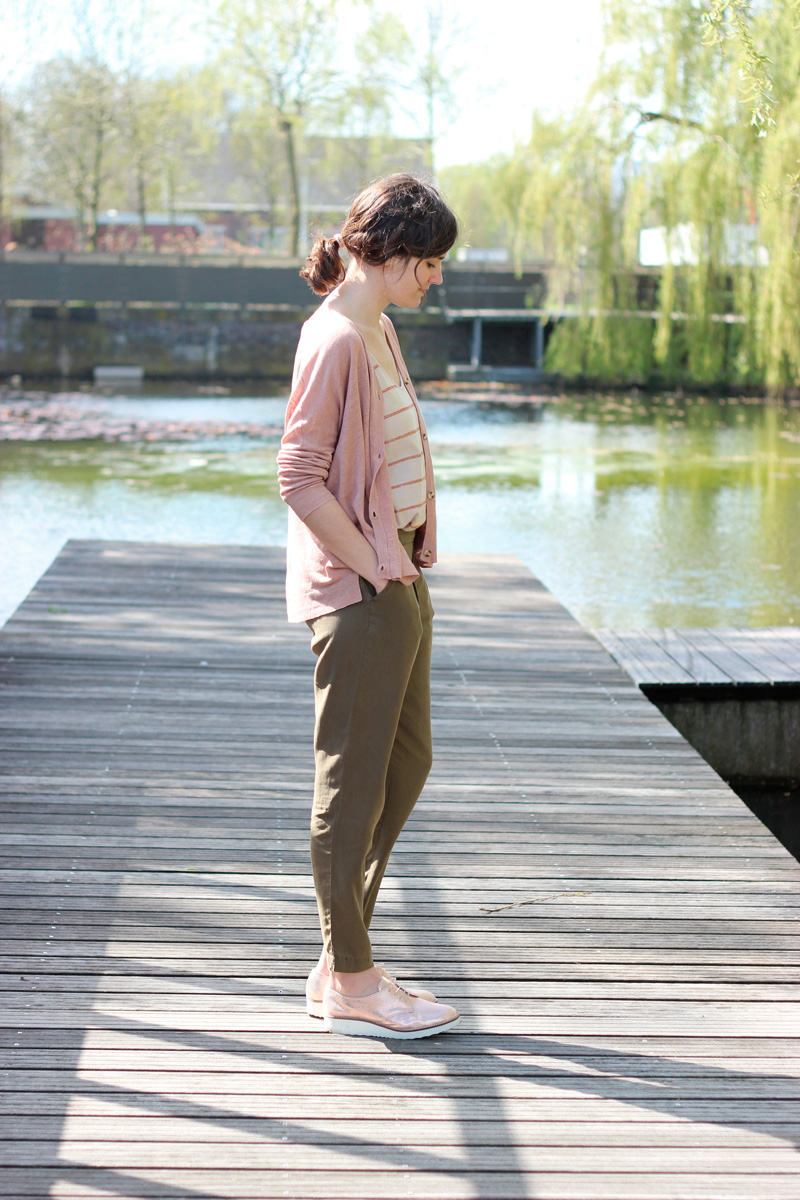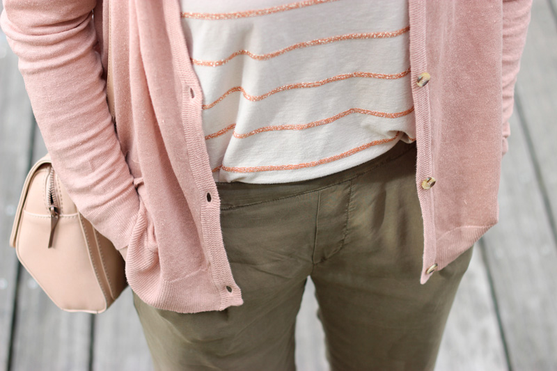9. Alors, perso, j’adore! Le rose poudré se marie super bien au kaki, c’est très harmonieux (et ça donne bonne mine!!). Petit coup de cœur pour la veste rose et le débardeur ♥ L’ensemble te va très bien