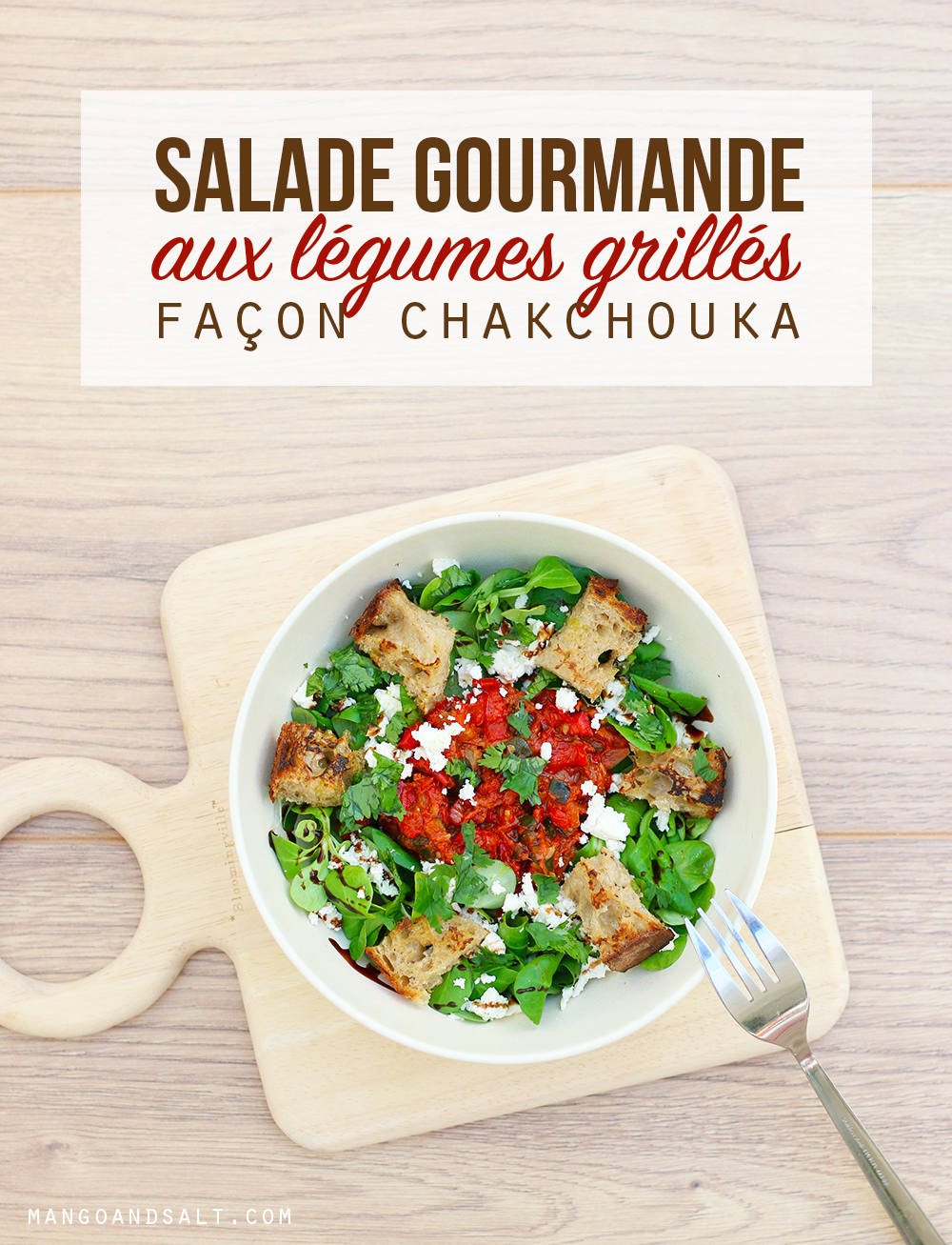 Inspirée par la délicieuse chakchouka de Marion (que je réalise en version végétarienne, et un peu plus épicée !), j’ai eu envie de retrouver le même type de saveurs dans une version fraîche. Les pays méditerranéens utilisent souvent des légumes rôtis pour leurs salades: j’ai décidé de faire la même chose avec un mélange relevé des mêmes épices que la chakchouka, mais un peu plus solide, et servi froid.
