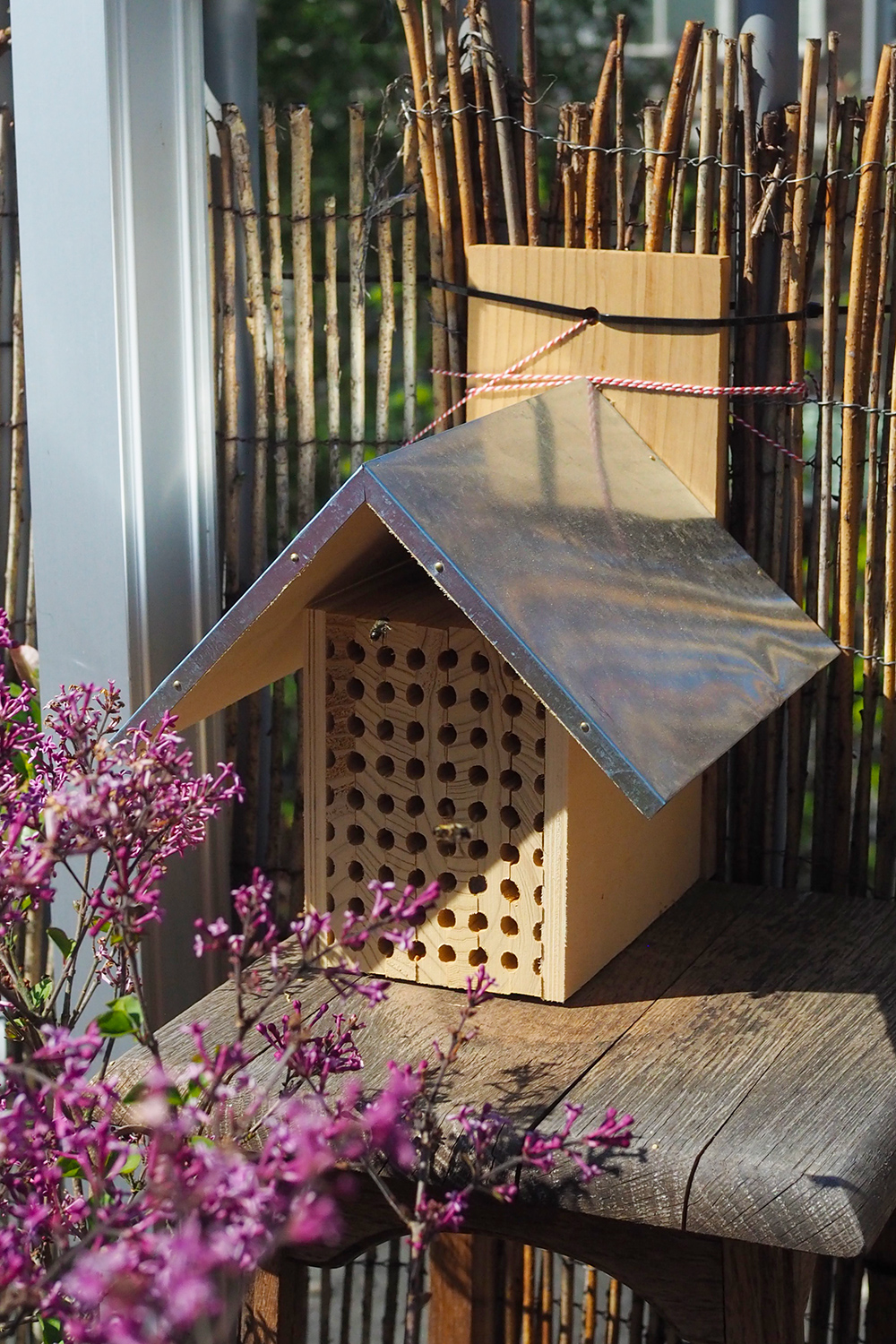 Ma terrasse étant exposée à l’Ouest, j’ai personnellement dû fixer mon nichoir à la rambarde avec un système D. Pour plus de stabilité, je l’ai placé de façon à ce qu’il soit posé sur un haut tabouret en bois, et les abeilles ont adoré: elles ont utilisé cette surface pour prendre des bains de soleil. En cas de météo pluvieuse, j’accroche une grande jardinière sur le rebord de la rambarde juste au dessus pour créer une sorte d’auvent.